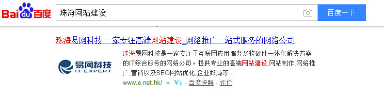 例如:易網(wǎng)科技是一家專(zhuān)注于網(wǎng)站建設(shè)和網(wǎng)絡(luò)推廣的公司,搜索關(guān)鍵詞“珠海網(wǎng)站建設(shè)”(用戶(hù)搜索量非常大的詞),就可以在百度 首頁(yè)找到易網(wǎng)科技官網(wǎng)。